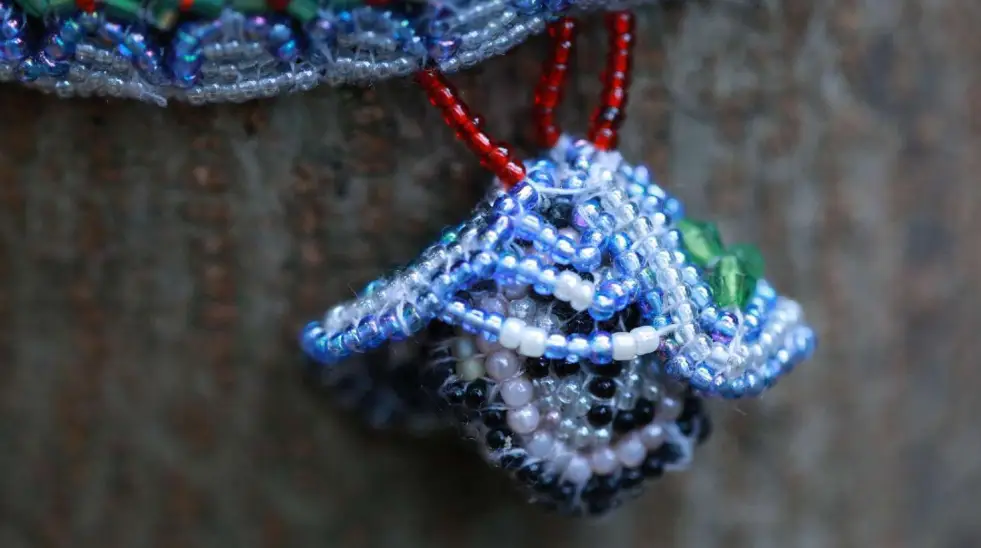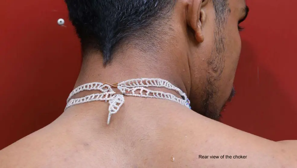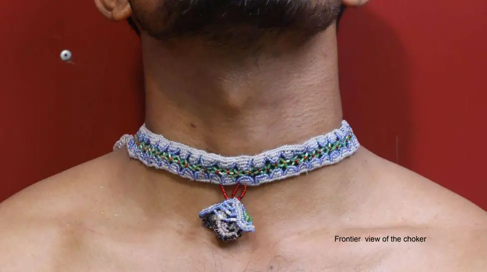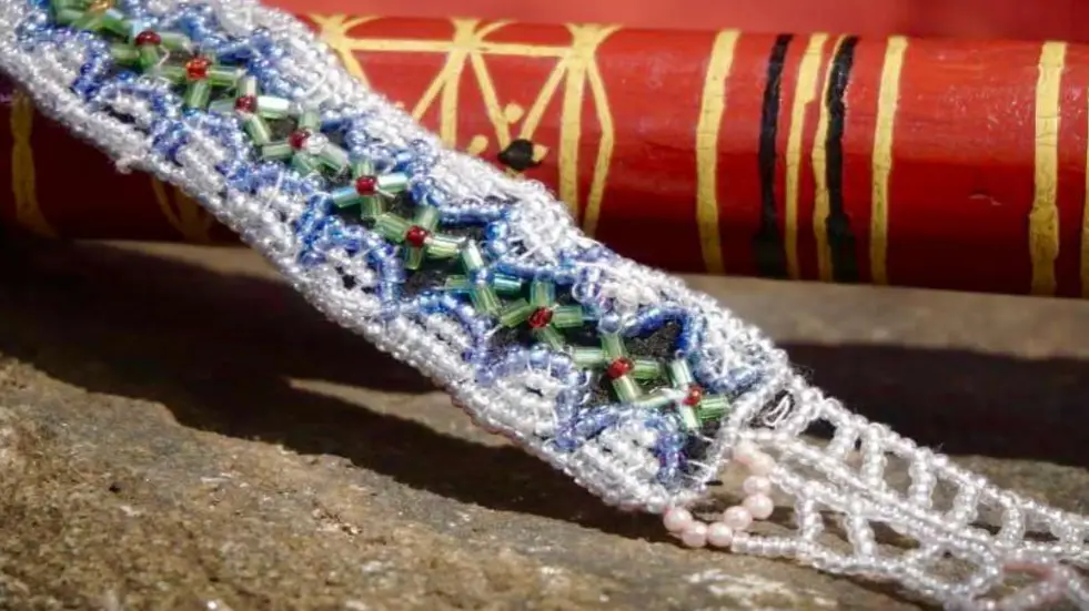 Material: wooden beads, glass beads, wood bark, stone cut beads, recycled fabric, copper wire, cotton threads.