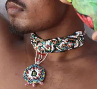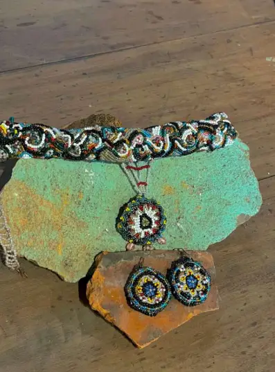 Material: glass beads, recycled fabric, copper wire, cotton threads.